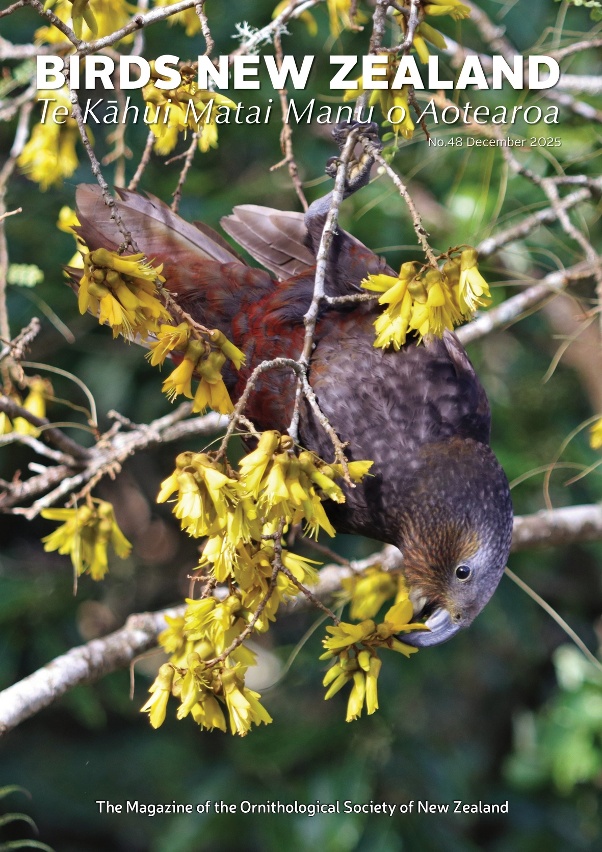 The December 2025 edition of Birds New Zealand magazine has been published with a cover photo featuring a Kākā feeding on flowering Kōwhai. This summer’s edition includes reports on new research funded by the 2024 Birds New Zealand Research Fund on Long-tailed Cuckoo tracking, Fluttering Shearwater and Spotless Crake monitoring, a repeat nationwide Black-billed Gull survey, the diets of kiwi chicks and Chatham Taiko and Chatham Petrel, and the ecological requirements of Australasian Bittern.